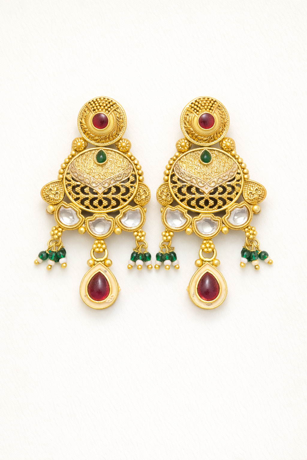 Elevate your ethnic look with these beautifully crafted traditional chandbali earrings, designed with intricate gold detailing and rich red, green & white stone work.