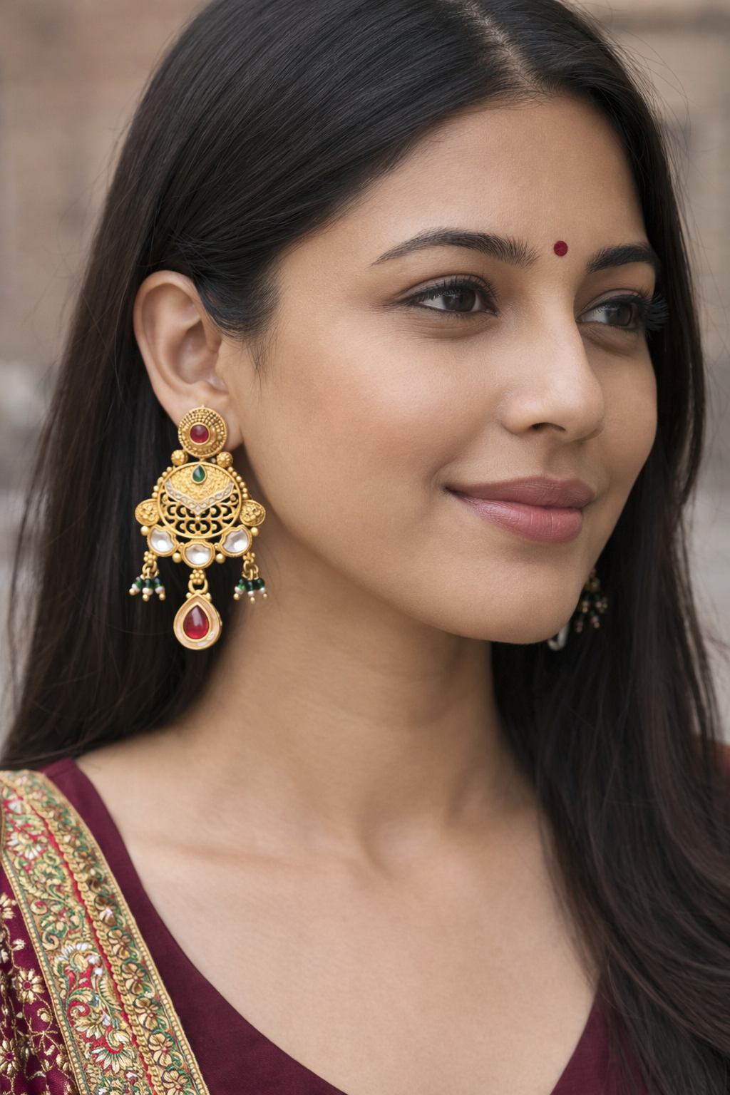 The elegant hanging drop design adds a royal and festive charm, making these earrings a perfect choice for weddings, festivals, and special occasions.