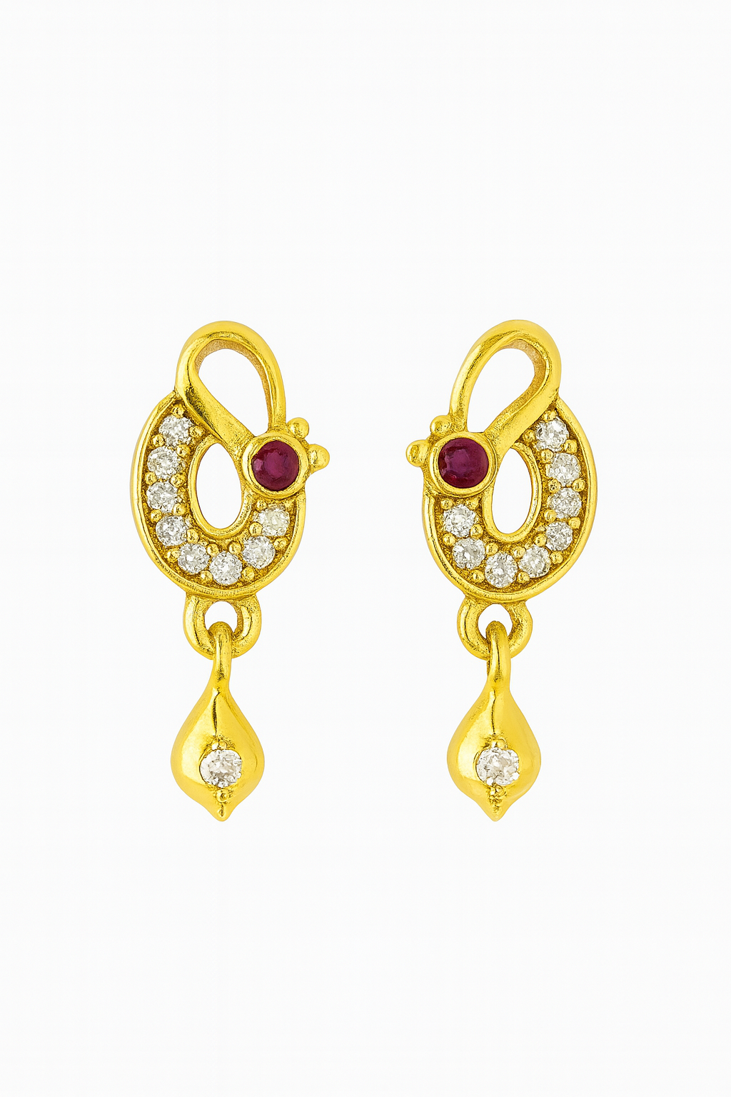 Enhance your festive look with these elegant oval gold-tone drop earrings. Designed with a beautiful ruby-red center stone, surrounded by a sparkling CZ-studded oval frame, these earrings finish with a graceful teardrop dangle featuring a diamond-look stone. The unique looped top design adds a modern touch to this traditional piece.