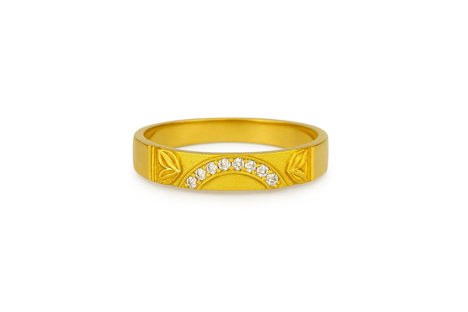 Upgrade your everyday look with this elegant gold-tone half-stone ring, designed with a beautiful arc-shaped stone setting and delicate leaf engraving on both sides. The sparkling diamond-look CZ stones add a luxurious shine, making this ring a perfect blend of simplicity and elegance.